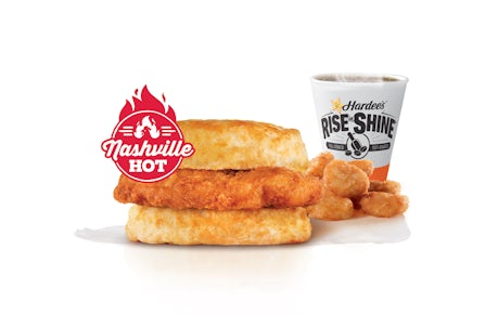 Premium all white meat chicken, hand dipped in buttermilk, lightly breaded, and fried to a golden brown. Finished with a with spicy seasoning and served on a warm, fluffy Made from Scratch™ Biscuit. Served with Hash Rounds® and your choice of beverage.