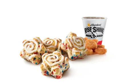 Four freshly baked, warm, fluffy star-shaped biscuit loaded with red and blue sprinkles, a trio of berry flavors, and drizzled with icing. Served with Hash Rounds® and a drink.