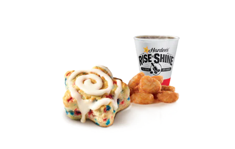 Freshly baked, warm, fluffy star-shaped biscuit loaded with red and blue sprinkles, a trio of berry flavors, and drizzled with icing. Served with Hash Rounds® and a drink.