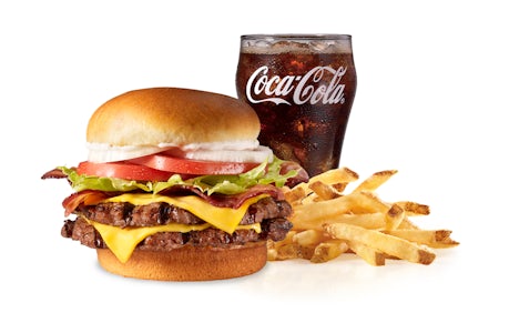 Our Double Bacon Cheeseburger Combo will leave you with that good feeling every time. We take two Quarter Pound 100% Angus beef patties and top them with mayonnaise, bacon, melted American cheese, lettuce, tomatoes and sliced onion. It all comes stacked on a perfectly toasted Brioche style bun. A side of fries and beverage complete your meal.