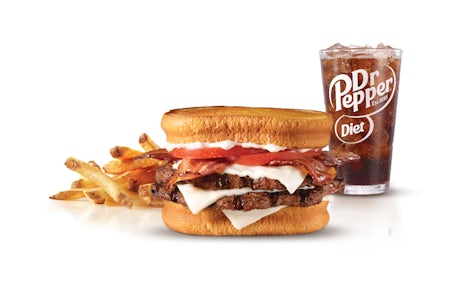 Meal good and feel good with the Double Hardee's Frisco® Combo. We take two Quarter Pound 100% Angus beef patties and top them with crispy bacon, melted Swiss cheese, tomatoes and mayonnaise all served on perfectly toasted sourdough bread. We complete the combo with a side of fries and beverage of your choice.