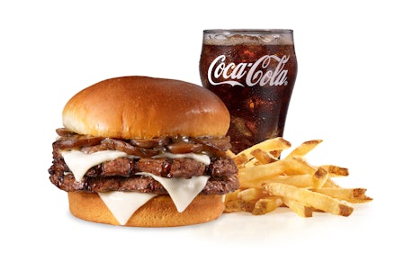 Our Double Mushroom & Swiss combo is loaded with goodness, starting with two Quarter Pound 100% Angus beef patties. We top them with melted Swiss cheese and savory mushroom sauce, and it all comes served on a perfectly toasted Brioche style bun. A side of fries and a beverage complete this meal sure to leave you with that good feeling.