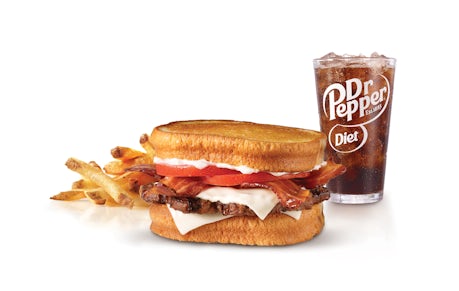 This unforgettably good burger features a Quarter Pound 100% Angus beef patty topped with crispy cherrywood smoked bacon, melted Swiss cheese, tomatoes and mayonnaise all on perfectly toasted sourdough bread. A side of fries and beverage of your choice complete the meal. Don’t forget to download our app and join My Rewards to earn Stars for each delicious order!