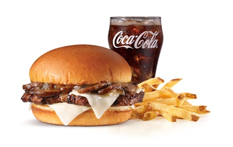 Our unforgettably good Mushroom & Swiss burger features a Quarter Pound 100% Angus beef patty topped with melted Swiss cheese and savory mushroom sauce, all served on a perfectly toasted Brioche style bun. A side of fries and beverage complete the combo.