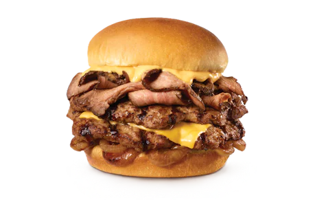 Two of our Angus Beef patties topped with Prime Rib slices that are dipped in our signature Au Jus, topped with Garlic cheddar sauce, grilled onions and served on our perfectly toasted Brioche Bun.