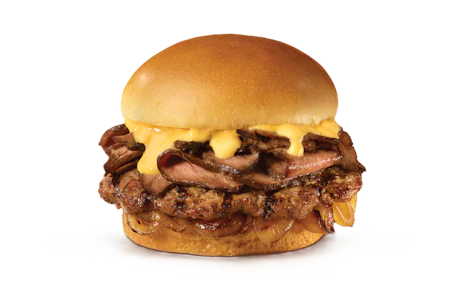 Our Angus Beef patty topped with Prime Rib slices that are dipped in our signature Au Jus, topped with Garlic cheddar sauce, grilled onions and served on our perfectly toasted Brioche Bun.