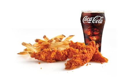 Premium all white meat chicken, hand dipped in buttermilk, lightly breaded, and fried to a golden brown. Finished with a with spicy seasoning and your choice of dipping sauce. Served with fries and your choice of beverage.