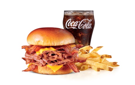 Sliced roast beef and melted American cheese served on a Brioche style bun. Served with Horseradish or BBQ. Served with Fries and a Soft Drink.
