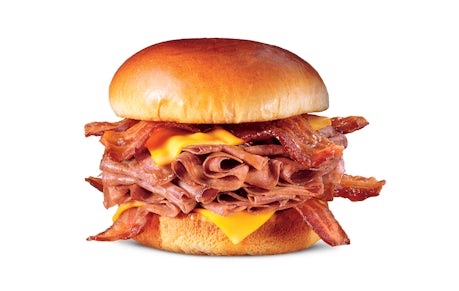 Sliced roast beef stacked between two slices of American cheese, four strips of bacon and au jus sauce on a toasted Brioche style bun.