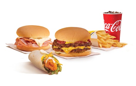 Choice of Two: Original Hot Ham 'N' Cheese Sandwich, Double Cheeseburger, or Hand-Breaded Chicken Tender Wrap (choose your flavor), or Spicy Chicken Sandwich. Includes Fries & Drink. You can also choose a two Double Cheeseburger bag for only $1 more!