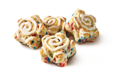 Four freshly baked, warm, fluffy star-shaped biscuit loaded with red and blue sprinkles, a trio of berry flavors, and drizzled with icing.